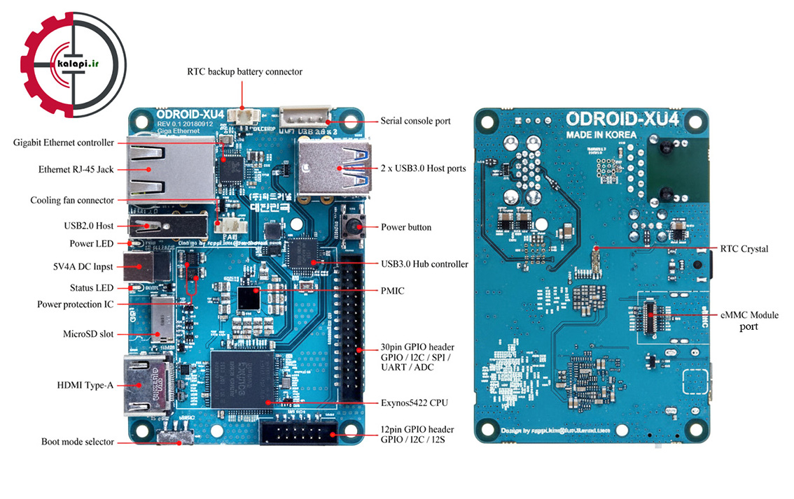 برد ODROID XU4 با بهرهگیری از پردازنده قدرتمند Samsung Exynos5422 مجهز به معماری big.LITTLE، امکان استفاده از چهار هسته Cortex-A15 با فرکانس ۲ گیگاهرتز و چهار هسته Cortex-A7 با فرکانس ۱.۴ گیگاهرتز را برای کاربران فراهم میسازد. این ترکیب باعث افزایش قدرت پردازش و بهینهسازی مصرف انرژی میگردد. رم ۲ گیگابایتی LPDDR3 PoP و پردازنده گرافیکی Mali-T628 MP6 این برد را برای پردازشهای سنگین، اجرای بازیهای سهبعدی و انجام وظایف محاسباتی مناسب میکند. این برد از حافظههای eMMC 5.0 و کارت microSD پشتیبانی نموده و از طریق دو پورت USB3.0، یک پورت USB2.0، خروجی HDMI 1.4a و درگاه اترنت گیگابیتی، به دستگاهها و شبکه متصل میشود. ODROID XU4 از سیستمعاملهای لینوکس (اوبونتو) و اندروید پشتیبانی میکند و با ابعاد کوچک و وزن سبک، گزینهای ایدهآل برای پروژههای سبک و صنعتی بهشمار میرود.