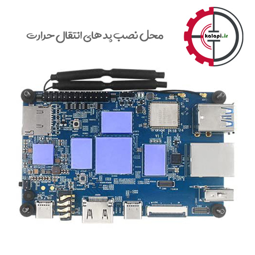 روی چیپ اصلی: بزرگترین چیپ روی برد اورنج پای 5 پلاس معمولاً بیشترین گرما را تولید میکند. بنابراین، یک پد حرارتی بزرگ در روی این چیپ قرار میگیرد تا حرارت را به بدنه آلومینیومی کیس منتقل کند.